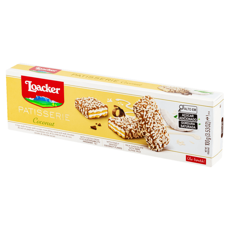 Loacker Gran Pasticceria é um biscoito italiano cheio de requinte e sabor. Um divino creme de coco entre wafers deliciosamente finos, coberto com chocolate ao leite e polvilhado com flocos de coco frescos. Uma combinação de dar água na boca.