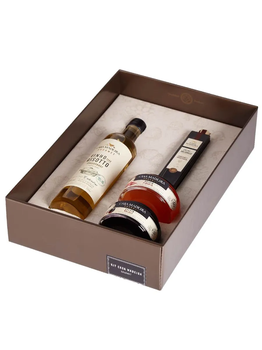 Kit gourmet Casa Madeira, composto por: 1 Vinho para Risotto 1 Creme Balsâmico Cabernet Sauvignon 1 Geleia Gourmet de Pimenta 1 Geleia Gourmet de Malbec.